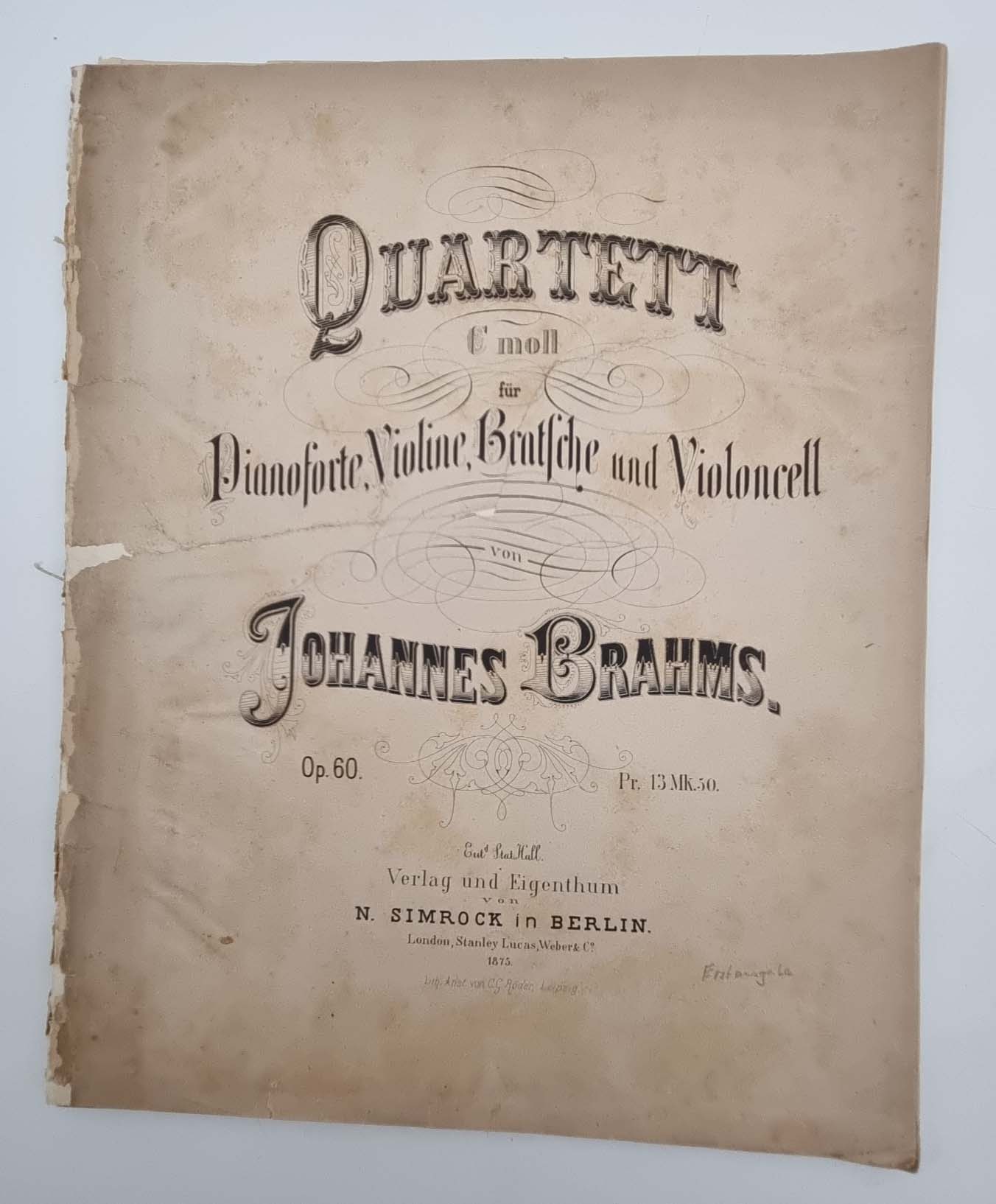 Brahms, Konvolut Noten. 1) Quartett C moll für das Pianoforte, Violine, Bratsche