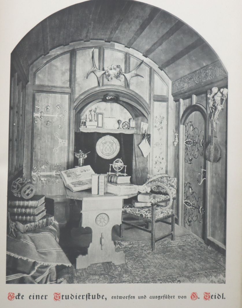Zeitschrift des Kunst-Gewerbe-Vereins in München. Jahrgang 1884. München, Knorr & Hirth, 1884. Ca. 36 x 26 cm. (4) S., 102 Seiten Text mit Textillustrationen, 41 Tafeln mit Abbildungen. Halbleinenband der Zeit. Teils etwas braunfleckig. Aus dem Inhalt u.a.: K. Haushofer: Ueber Schmucksteine; Die Kunstsammlung Lorenz Gedon; M. Haushofer: die Poesie unseres Hausraths; H. Speckter: Ueber Heraldik.