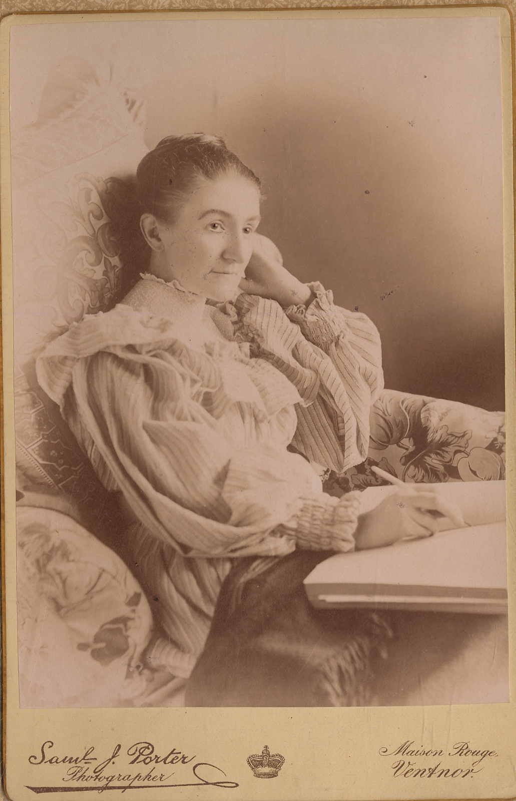 Allen, Phoebe: „Whispering Tongues“. London, Society for promoting Christian Knowledge, (1869). Ca. 19 x 12,5 cm. 160 S., (8) Seiten. Mit Illustrationen von F. Barnard. Roter illustrierter Original-Einband. Mit einer auf dem Vorsatz einmontierten Originalfotografie (auf fester Pappe) – diese zeigt vermutlich die britische Schrifstellerin Phoebe Allen (1858-1933). Mit einem handschriftlichen Gruß zu Weihnachten 1896 auf dem Titelblatt. Einband minimal fleckig, jedoch gutes Exemplar. In englischer Sprache.