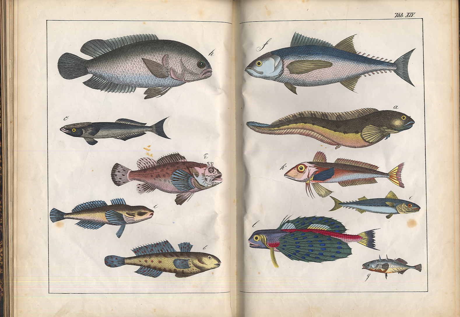 Schubert, G[otthilf] H[einrich] v.: Naturgeschichte der Amphibien, Fische, Weich- und Schalenthiere, Insekten, Würmer und Strahlenthiere in Bildern, treu theils nach der Natur, theils auch nach den ausgezeichnetsten zoologischen Bildersammlungen gezeichnet, fein und getreu colorirt zum Anschauungs-Unterricht für die Jugend in Schulen und Familien nach der Anordnung des allgemein bekannten und beliebten Lehrbuchs der Naturgeschichte für Schulen von G. H. v. Schubert. Außerdem zu jedem Lehrbuch der Naturgeschichte passend, mit erklärendem Texte in deutscher und französischer Sprache. Stuttgart und Eßlingen, Schreiber & Schill, um 1850. Ca. 31,5 x 22 cm. (4) S., 24 Seiten Text, 30 doppelblattgroße handcolorierte Tafeln. Etwas späterer Halbleinenband mit handgeschriebenem Deckelschild. Teils etwas stockfleckig. Tafel 11 auf der linken Seite beschädigt. Die schön koloriertenTafeln bilden Fische, Schildkröten, Wale, Rochen, Frösche, Echsen, Muscheln, Käfer, Libellen, Schmetterlinge, Raupen, Quallen, Krebse, Krabben u. v. m. ab. Nicht datierte Ausgabe, nach der Umfirmierung zu „Schreiber & Schill“ 1846.