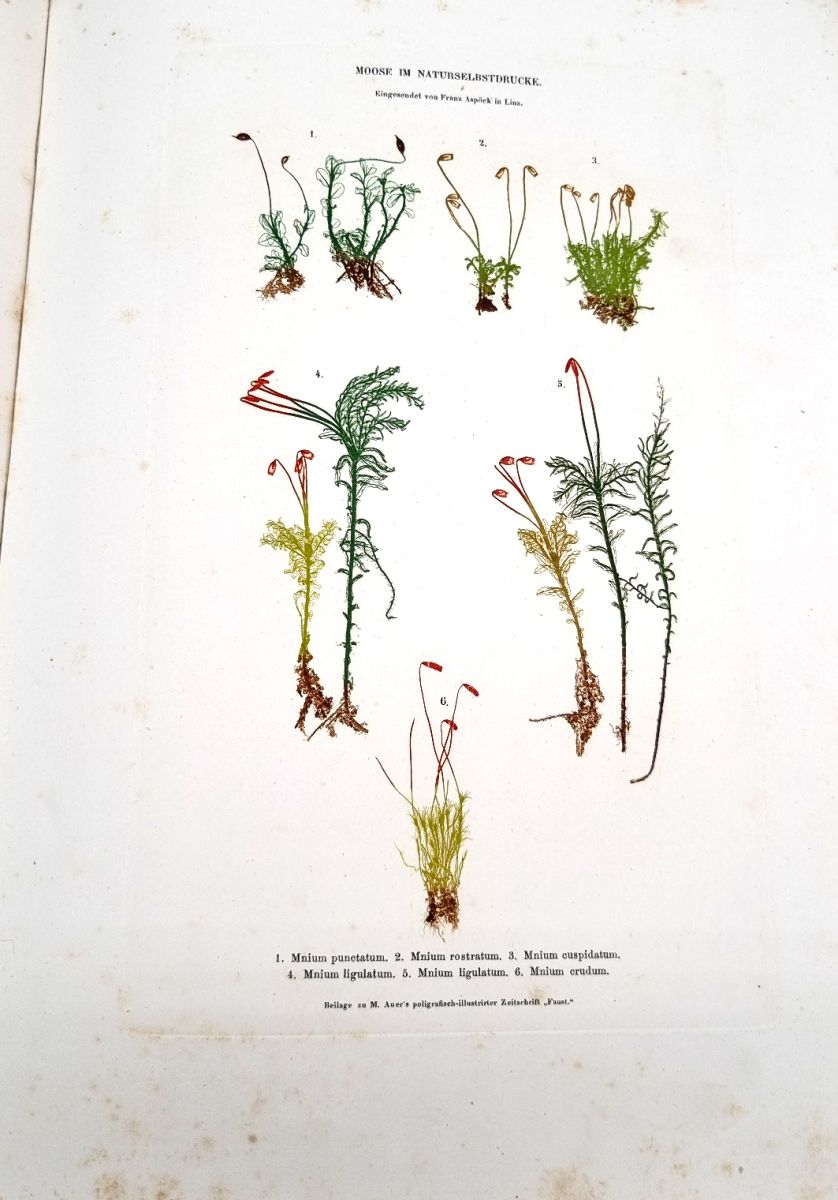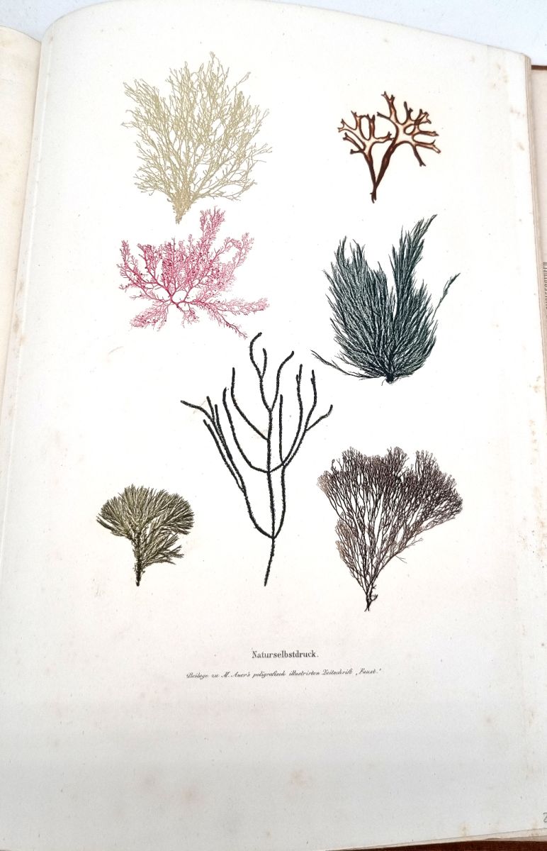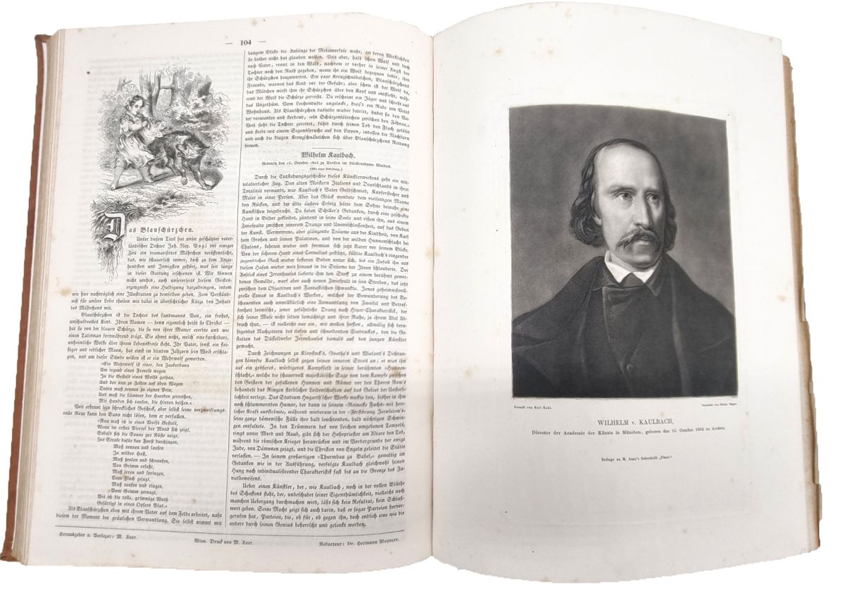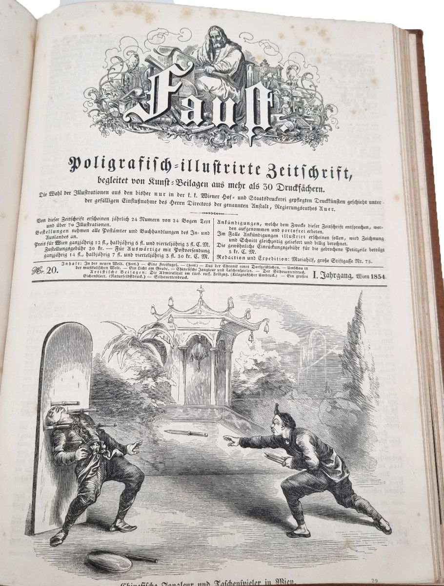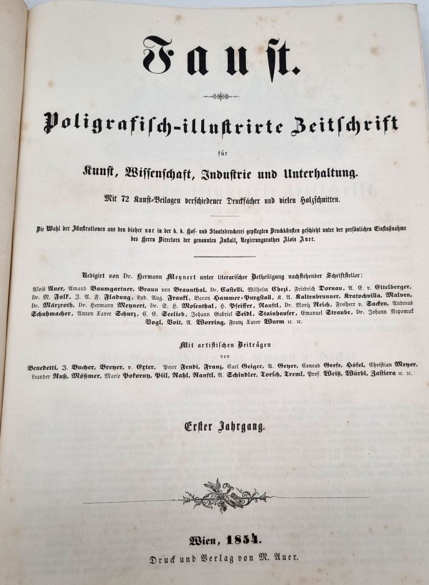 Faust. Poligrafisch-illustrirte Zeitschrift für Kunst, Wissenschaft, Industrie und Unterhaltung. Redigirt von Hermann Meynert unter literarischer Betheiligung nachstehender Schrifsteller: Alois Auer, Amand Baumgartner, Braun v. Braunthal, Dr. Castelli, Wilhelm Chezi, Friedrich Dornau, A.E. v. Eitelberger, M. Falk, J.A.F. Fladung, Lud. Aug. Frankl, Baron Hammer-Purgstall, K.a. Kaltenbrunner, Kratochvilla, Malven, Dr. Märzroth, Dr. Hermann Meynert, Dr. S.H. Mosenthal, H. Pfeiffer, Ranftl, Dr. Moriz Reich, Freiherr v. Sacken, Andreas Schuhmacher, Anton Xaver Schurz, C. E. Seelieb, Johann Gabriel Seidl, Stainhauser, Emanuel Straube, Dr. Johann Nepomuk Vogl, Voit, A. Worring, Franz Xaver Wurm etc. etc. Mit artistischen Beiträgen von Benedetti, J. Bucher, Breyer, v. Exter, Peter Fendi, Franz, Carl Geiger, A. Geyer, Conrad Grefe, Hösel, Christian Meyer, Leander Ruß, Mößmer, Marie Pokorny, Piil, Rahl, Ranftl, A. Schindler, Torsch, Treml, Prof. Weiß, Würbl, Zastiera etc. etc. 1. Jahrgang. Wien, Druck und Verlag von M. Auer, 1854. Ca. 35 x 25,5 cm. 192 Seiten, mit zahlreichen Textholzschnitten und allen 72 Kunst-Beilagen verschiedener Druckfächer. Leineneinband der Zeit mit reicher Goldprägung. Komplettes Exemplar mit allen Beilagen des wesentlichen 1. Jahrgangs (bis 1861 erschienen 8 Jahrgänge) dieses grundlegenden Werkes über den „Naturselbstdruck“, u.a. mit folgenden Abhandlungen von Alois Auer von Welsbach (1813-1869): „Der poligrafische Apparat; Ueberblick des technischen Verfahrens und die Anwendung der verschiedenen Druckkünste“; „Die Entdeckung des Naturselbstdruckes oder die Erfindung, von ganzen Herbarien, Stoffen, Spitzen, Stickereien und überhaupt allen Originalien und Copien, wenn sie auch noch so zarte Erhabenheiten und Vertiefungen an sich haben, durch das Original selbst auf einfache und schnelle Weise Druckformen herzustellen, womit man sowohl weiß auf gefärbtem Grunde drucken und prägen, als auch mit den natürlichen Farben auf weißem Papiere Abdrücke, dem Originale identisch gleich, gewinnen kann, ohne daß man einer Zeichnung oder Gravure auf die bisher übliche Weise durch Menschenhände bedarf“; „Eigenthumsstreit bei neuen Erfindungen, insbesondere bei dem in der k. k. Hof- und Staatsdruckerei in Wien entdeckten Naturselbstdrucke“. Alle 72 Beilagen (darunter 10 Naturselbstdrucke und 7 Originalselbstdrucke) entsprechend dem Inhaltsverzeichnis enthalten: 1) Österreichs Bitte (Musikbeilage); 2) Peter Cornelius (Stahlstich, geschabt von Christian Meyer); 3) Mutter und Kind (Stahlstich, geschabt von Thomas Benedetti); 4) Alfabeten-Stammbaum (Litografirte Gravüre); 5) Die Kinder und der Vogel (Radirung in Stahl); 6) Häckelmuster von Marie Pokorny (Originalselbstdruck); 7) Moose (Naturselbstdruck); 8) Der steierische Hirtenknab von Ranftl (Kreidezeichnung); 9) Sebastopol und Adrianopel (Gravüre in Stein); 10) Moose (Naturselbstdruck in Farben); 11) Spitzen (Originalselbstdruck); 12) Ideal einer Landschaft (Radirung in Kupfer); 13) Das Industrie-Ausstellungsgebäude in München (Zinkradirung und Umdruck); 14) Ein Kroaten-Vorposten (Kupferdruck); 15) Die Zwillinge (Kupferstich); 16) Der kleine Musikant (Schabmanier); 17) Tiroler Welden-Freiwilliger (Kupferstich); 18) Constantinopel und Jassy (Zinkradirung); 19) Moose (Naturselbstdruck); 20) Grundplan des Industrie-Ausstellungsgebäudes in München (Litografie); 21) Die ersten Studien (Kupferstich); 22) Karl Heinrich Rahl (Kupferstich); 23) Eine durchschnittene Achatmandel aus Sachsen (Naturselbstdruck); 24) Die Rückkehr aus dem Feldzuge (Kupferstich); 25) Peter Heß (Stahlstich); 26) Der Dorf-Dilettant (Kupferstich); 27) Ideale Landschaft (Radirung in Kupfer); 28) Die Sulinamündung und Rustschuk (Zinkradirung); 29) Der Wasserfall (Holzätzung nach Ranftl’schem Verfahren); 30) Der Haase (Originalselbstdruck); 31) Der Hundskopf (Galvanografie); 32) Der Wiener Freiwillige (Kupferstich); 33) Das durchlöcherte Bild (Stahlstich); 34) Der Auerhahn (Originalselbstdruck); 35) Das Schachspieler (Xilografie); 36) Moose (Naturselbstdruck); 37) Wilhelm Kaulbach (Stahlstich); 38) Dorf aus Oberösterreich (Xilografie); 39) Die Tollkirsche (Naturselbstdruck); 40) Odessa (Umdruck auf Stein); 41) Kaiser Friedrich III Grabdenkmal im St Stefansdome zu Wien (Kupferstich, mit großem Einriss); 42) Auszeichnung und Entschluß (Radirung im Kupfer); 43) Lenaus Grabmal (Kupferstich); 44) Bomarsund (Umdruck auf Stein, mehrfach gefaltet, mit kleineren Randeinrissen); 45) Ideale Landschaft (Radirung in Kupfer); 46) Friedrich Hebbel (Stahlstich); 47) Flügelaltar zu Bartfeld in Ungarn (Kupferstich); 48) Kars und Bajasid (Umdruck auf Stein); 49) Die Krim-Expedition (Xilografischer Umdruck, doppelblattgroß); 50) Moose (Originalselbstdruck); 51) Weißstickerei (Originalselbstdruck); 52) Alle fünf Londoner Weltausstellungs-Münzen von 1851; 53) Farrenkraut im Naturselbstdruck; 54) Alfabete für Blinde; 55) Das Mädchen mit dem Medaillon (Galvanografie); 56) Spitzenkragen (Originalselbstdruck); 57) Zum Ereignis von Bomarsund (Xilografischer Umdruck); 58) Die Admiralität im türkisch-russischen Feldzug (Xilografischer Umdruck); 59) Ein großes Eichenblatt (Naturselbstdruck); 60) Silhouettendruck; 61) Der Sultan (Xilografischer Umdruck); 62) Holzdurchschnitte, Tafel 1 (Naturselbstdruck); 63) Madonna von Titian (Kupferstich); 64) Tipografische Ornamentik (Festgedicht); 65) Bibel-Abdruck; 66) Dürers Holzschnitte; 67) Mathias Ranftl (Stahlstich in geschabter Manier); 68) Glasdruck; 69) Algen (Meerpflanzen im Naturselbstdruck); 70) Gutenberg und Faust (Tipografischer Farbendruck, Exter’s neues Verfahren); 71) Jesukind von Titian (Kupferstich); 72) Ansicht von Wien (Chemitipie nach einer Fotografie). Einband etwas ausgeblichen, Kanten stärker bestoßen. Die Seiten und Tafeln teils stockfleckig, siehe auch Beschreibung bei den einzelnen Illustrationen. Vollständige Jahrgänge sind sehr selten, die Besitzer entfernten die dek