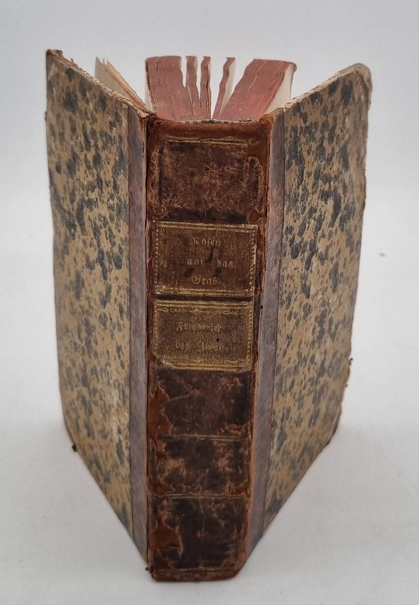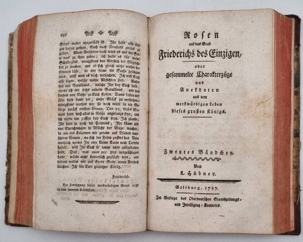 Hübner, L[orenz]: Rosen auf das Grab Friederichs des Einzigen, oder gesammelte Chrakterzüge und Anekdoten aus dem merkwürdigen Leben dieses großen Königs. 2 Bände in einem Band. Salzburg, Im Verlage des Oberdeutschen Staatszeitung- und Intelligenz-Komtoirs, 1787. Ca. 19,5 x 12 cm. Kupfer-Frontispiz (Porträt Friedrich II. von J. C. Schleich) 286 Seiten; 286 Seiten. Halblederband der Zeit mit geprägtem Rückentitel. Einband berieben und Kanten stärker bestoßen. Buchblock etwas gelockert. Hinteres Vorsatzblatt fehlt. Namenszug auf Titelblatt. Titelblatt zu Band 2 mit kleiner Fehlstelle im weißen Rand. Seiten teils am Rand leicht fingerfleckig. Erste Ausgabe, selten. Enthält auch zahlreiche Briefe Friedrichs II. (Friedrich der Große 1712-1786). L. Hübner (1753-1807, Gelehrter, Publizist und Topograph), stammte aus Donauwörth, war Jesuit und empfing 1774 die Priesterweihe.