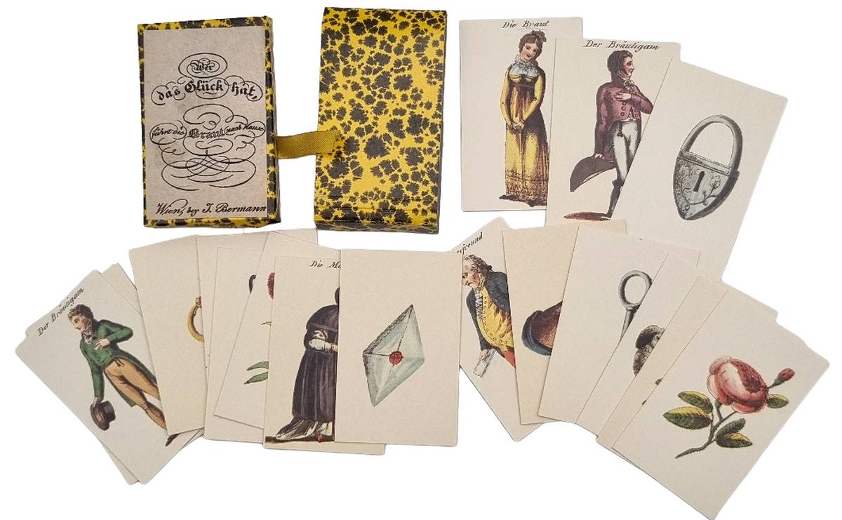 Kartenspiel – Wer das Glück hat, führt die Braut nach Hause. Nachdruck der Ausgabe Wien um 1850. Ohne Jahr und Verlag, ca. 1970er Jahre. Karton ca. 8 x 5,5 cm. 17 farbige Spielkarten. Mit Anleitung. Im Original-Schuber. Es handelt sich um ein Reprint eines Kartenspiels um 1850 des Wiener Kunsthändlers J. Bermann (1810-1886).