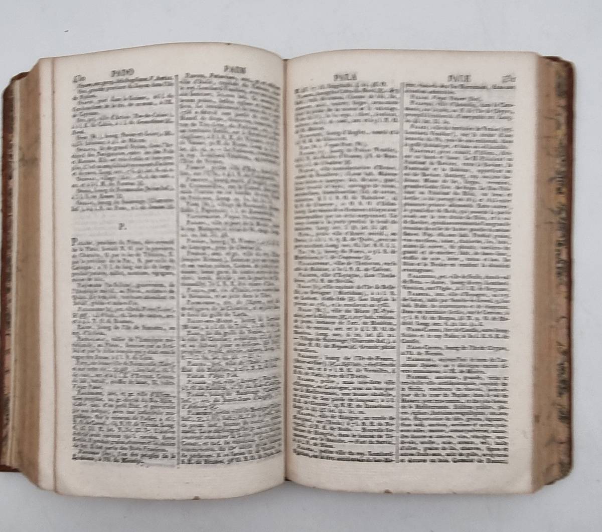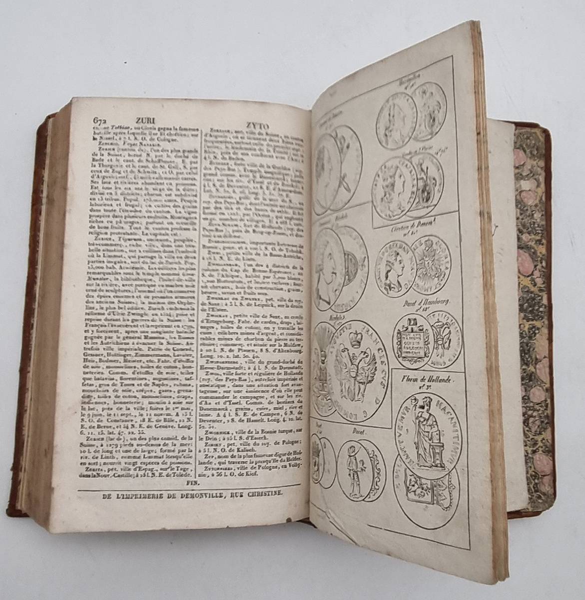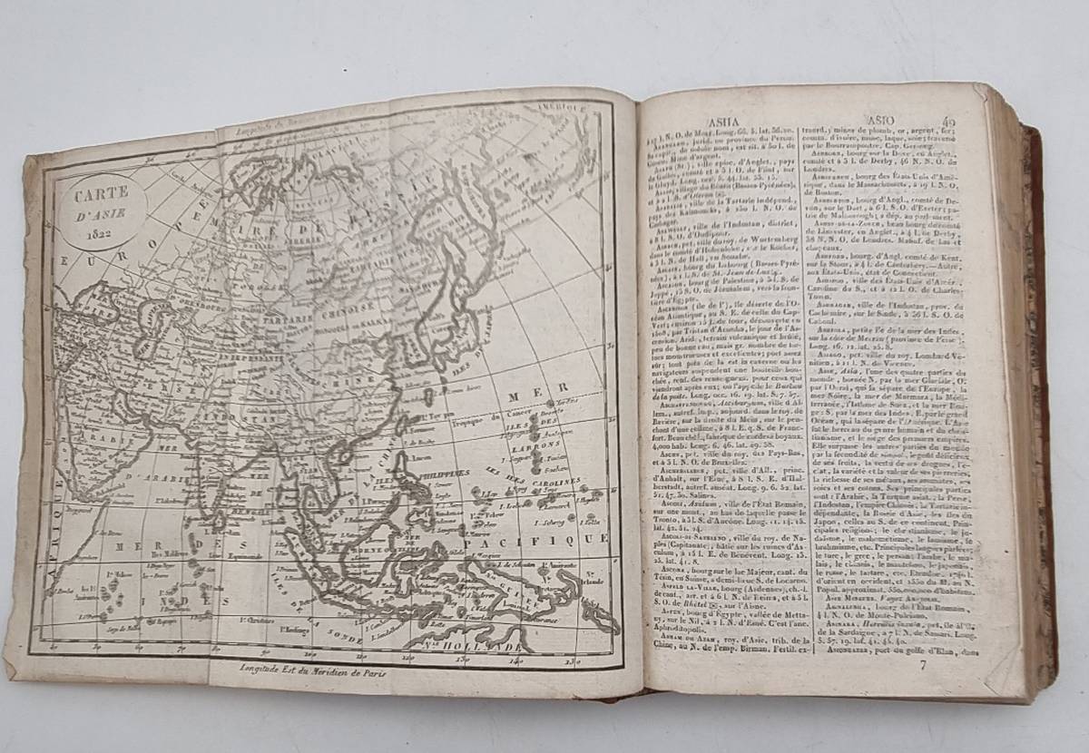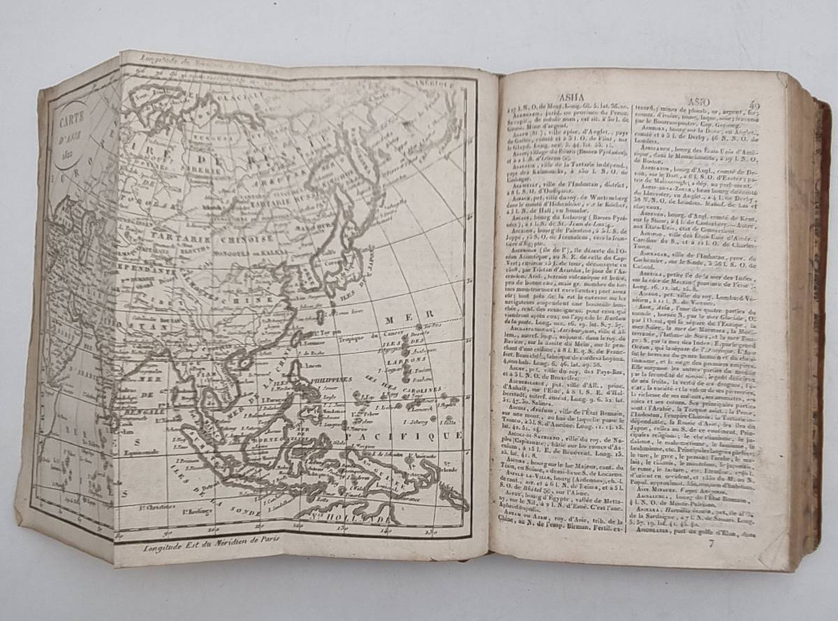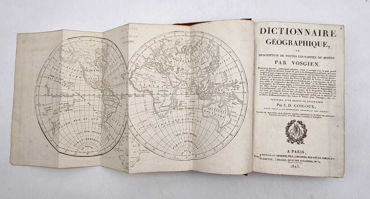Vosgien – Goigoux – Dictioinnaire Géographique, ou description de toutes les parties du monde par Vosgien. Nouvelle Édition … précédée d’un précis de geographie par J. D. Goigoux. Paris, Menard et Desenne u. Ledentu, 1823. Ca. 21 x 13 cm. VII S., 672 Seiten. Mit 7 gestochenen Kupferstichkarten (davon eine mit zusätzlich 20 handcolorierten Flaggenabbildungen), 6 Tafeln mit Münzabbildungen. Halblederband der Zeit mit Rückengoldprägung. Rücken neu mit Leder unterlegt. Kleiner Aufleber auf Innendeckel, alter Namenszug auf Vorsatz. Minimal stockfleckig. Die Karten: 2 Weltkarten mit kleiner Umlaufbahn der Erde um die Sonne; Royaume de France (hier am Rand die farbigen Flaggen verschiedener Länder); Carte d’Afrique 1823; Amérique méridionale 1823; Amérique septentrionale 1823; Carte d’ Asie 1822; Carte d’Europe 1823.