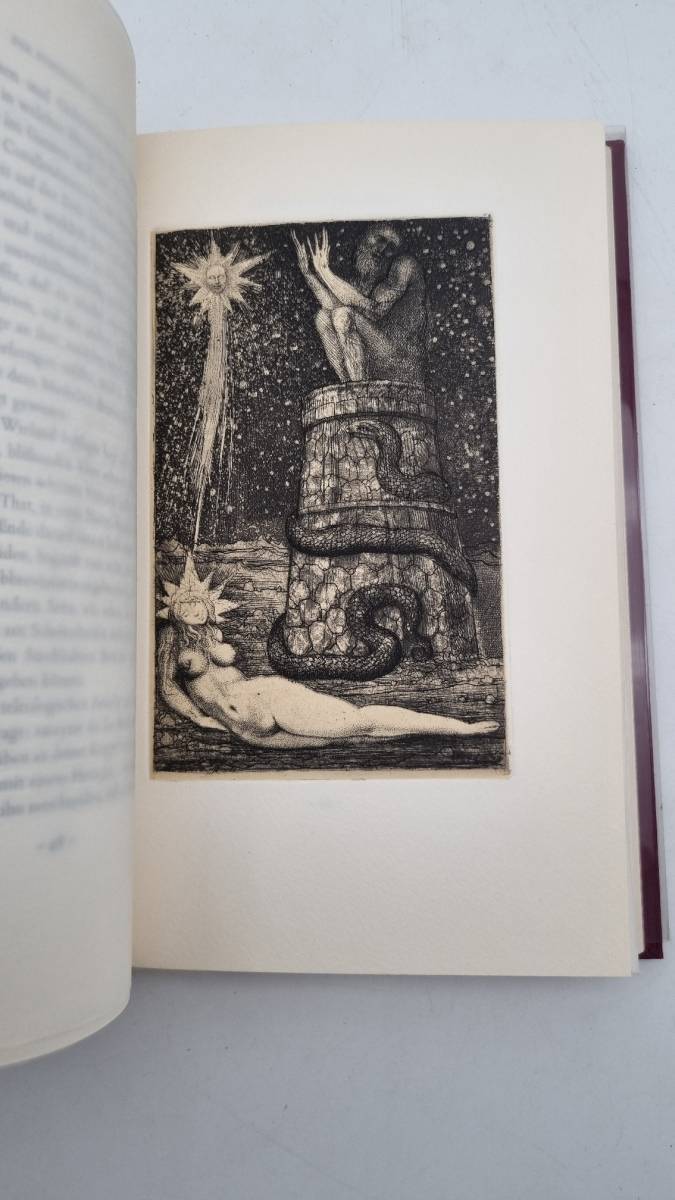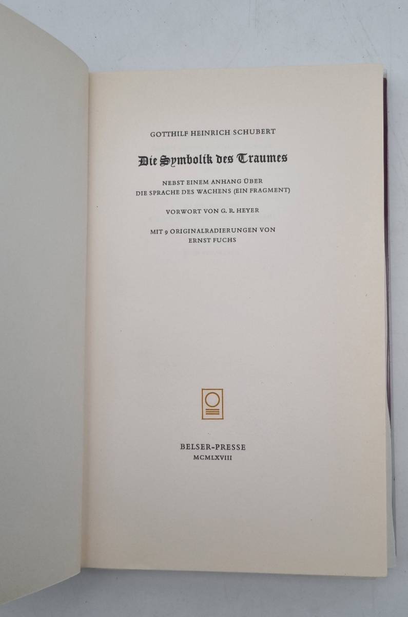 Schubert, Gotthilf Heinrich von: Die Symbolik des Traumes. Nebst einem Anhang über die Sprache des Wachen (ein Fragment). Vorwort von G.R. Heyer. Stuttgart, Belser-Presse, 1968. Ca. 24 x 15,5 cm. 212 S., (6) Seiten. Mit 9 Originalradierungen von Ernst Fuchs. Roter Orig.-Leinenband mit Rückentitel und Goldprägung. Exemplar Nr. 68/400. 3. Druck der Belser-Presse, im Druckvermerk von Ernst Fuchs signiert. Tadelloses Exemplar.