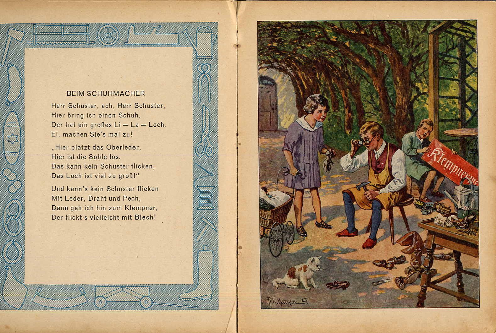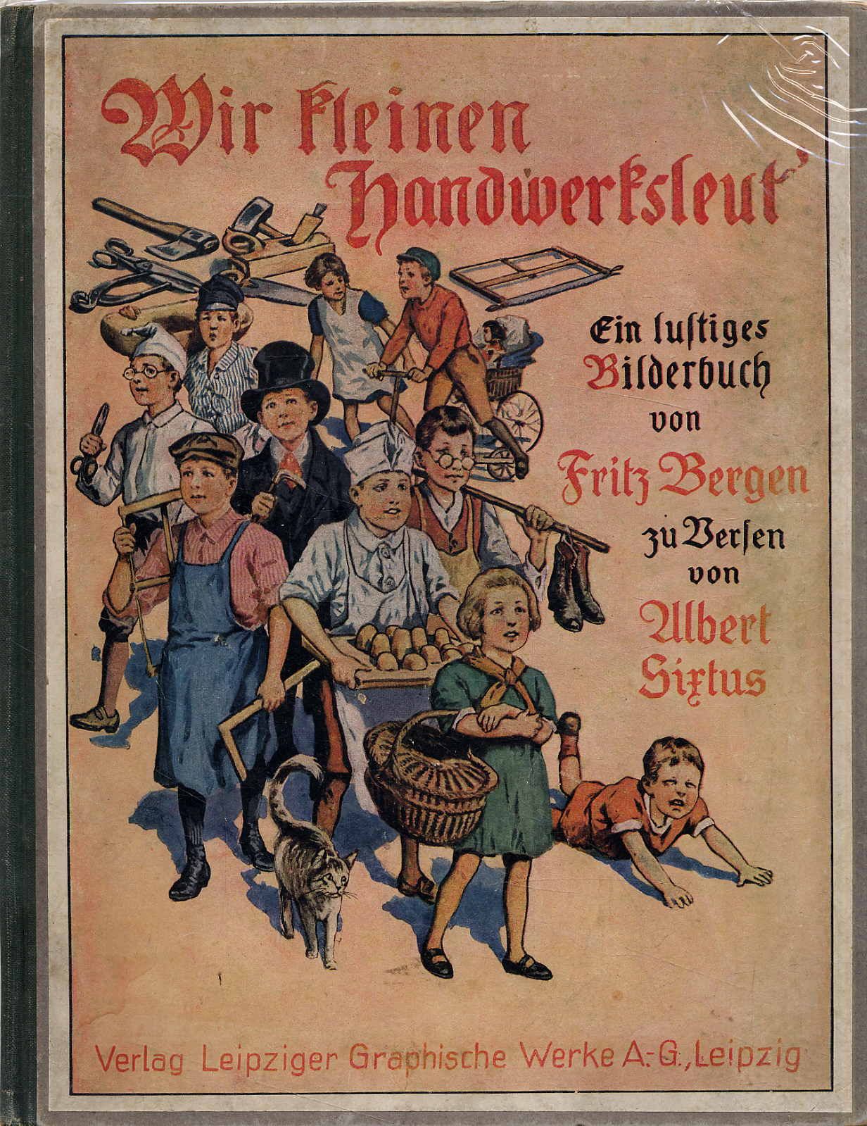 Sixtus, Albert: Wir kleinen Handwerksleut. Ein lustiges Bilderbuch. Leipzig, Verlag Leipziger Graphisches Werke, [1927]. Ca. 29,5 x 23,5 cm. (16) S., mit 7 ganzseitigen farbigen Bildern von Fritz Bergen. Farbig illustr. Orig.-Halbleinenband. Unbedruckte Ränder leicht fingerfleckig und zum Falz hin teils leicht berieben. Zu Versen von Albert Sitxus zeigen die Bilder von Fritz Bergen, wie Kindern das Handwerk nahe gebracht wird. „Was die Werkzeuge tun“, beim Tischler, Stellmacher, Schneider, Schuhmacher, Bäcker und Fleischer.
