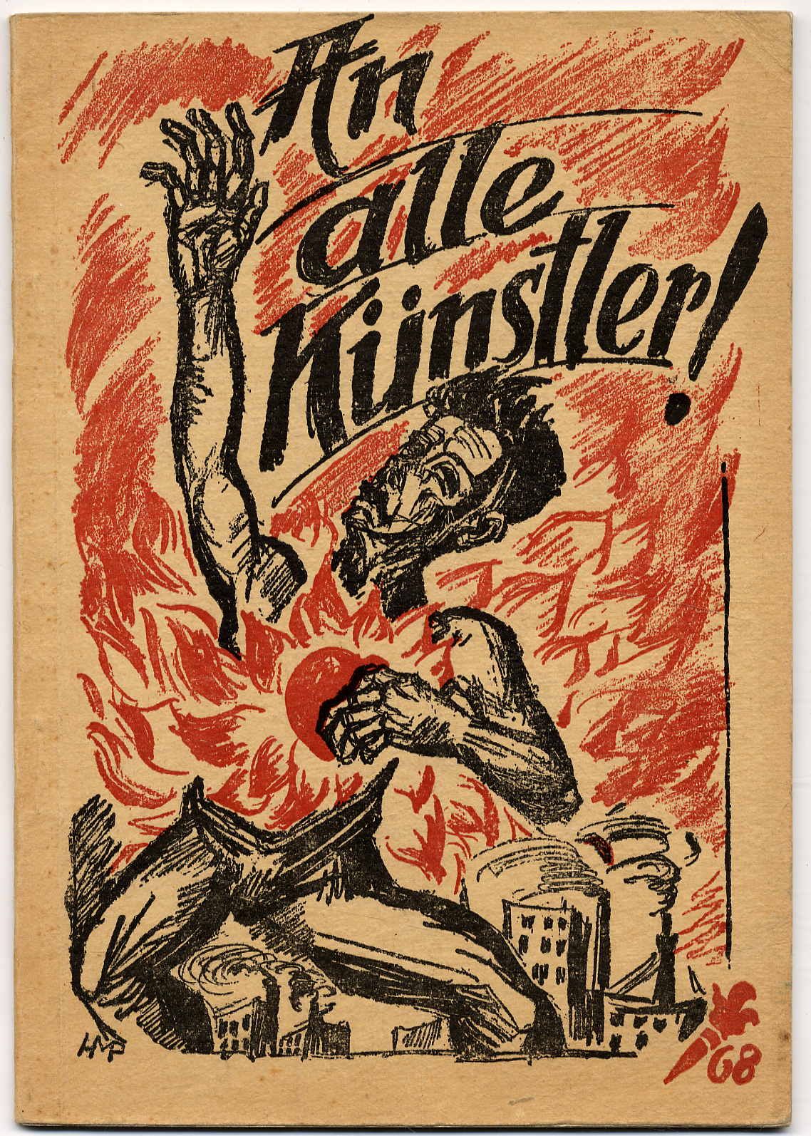 An alle Künstler! Berlin, 1919. 8°. 47 S. Mit Bildbeiträgen von Cesar Klein, Richter-Berlin, Lyonel Feininger, Milly Steger und Georg Tappert. Orig.-Broschur, farbig illustr. von Max Pechstein. Mit literarischen Beiträgen von Joh. R. Becher, Ludwig Meidner, Bernhard Kellermann, Max Pechstein, Walter Hasenclever, Kurt Eisner, Konrad Haenisch, Kurt Erich Meurer und Paul Zech. Mittig mit leichtem Knick. Ein Blatt am unteren Rand etwas knitterfaltig und mit kleinem Einriss.