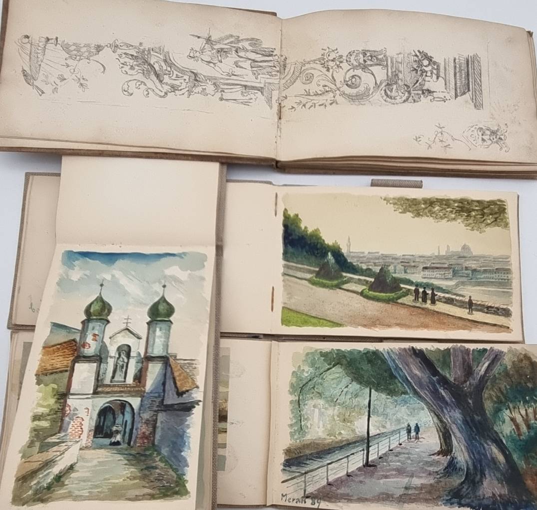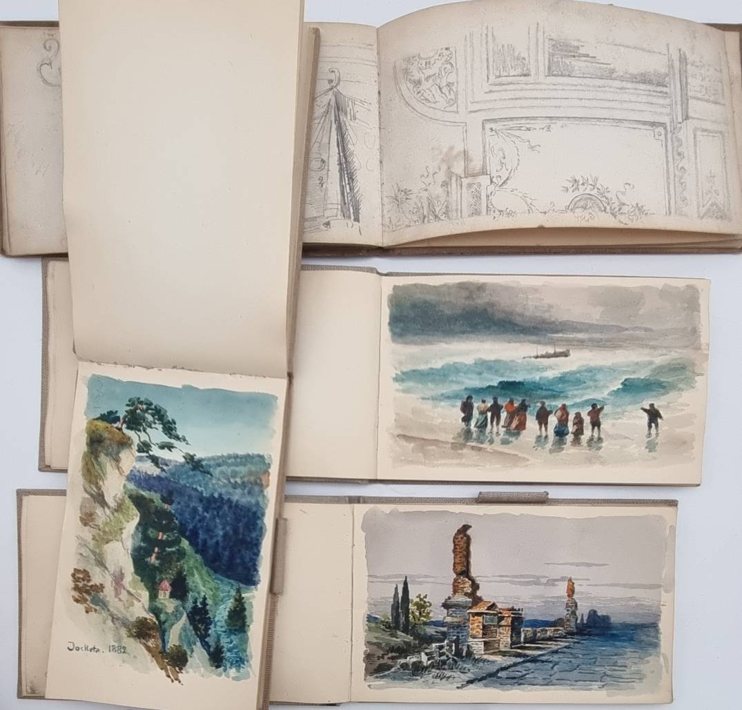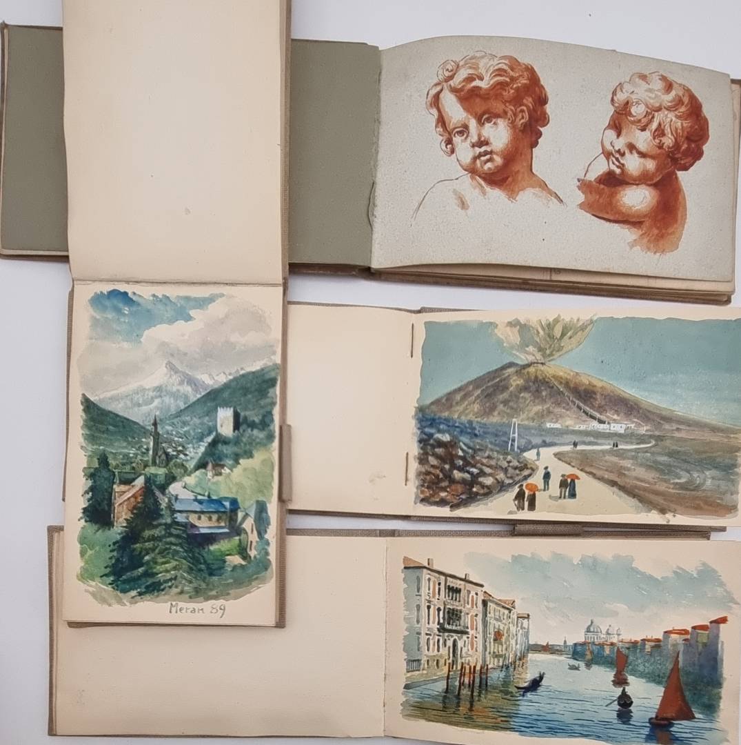 Leipoldt, Otto: Aus meinen Wanderungen. (3 Bände und ein Studienbuch). 4 Skizzenbücher einer Leipziger Künstlers. Mit mehr als 110 Aquarellen und Zeichnungen. 1869-1892. Querformat ca. 12 x 18,5 cm bzw. 12,5 x 20,5 cm. Graue Leineneinbände der Zeit. Auf den Innendeckeln mit Stempel „Otto Leipoldt Leipzig Sebastian Bach Str. 17“ und handschriftlichem Titel „Aus meinen Wanderungen“ sowie Datierung 1932. Das Einwohneradressbuch für Leipzig aus dem Jahr 1932 verzeichnet unter dieser Adresse einen „Otto Leipoldt“ mit der Berufsbezeichnung „Vertr[eter]. Die Bilder teils mit Datum versehen (1869-1892) und häufig mit Ortsangabe. Band I: Mit 27 Aquarellen u.a. London, Cornwall, Dartmouth, Rotterdam, Hamburg, München, Dillingen, St. Gotthart, Comer See, Lago Maggiore, Neapel; Band II: 30 Aquarelle u.a. „Mein Geburtshaus Rossmässlerstr. 8 (früher Waldstraße), Pleisenburg, Dresden, Görlitz, Alt Plauen, Burgstein, Werratal, Bremen, Meran, Hamburg, Holstein; Band III: Mit 26 Aquarellen, u.a.: Neapel, Rom, Florenz, Venedig; Band IV: Skizzenbuch: Mit ca. 30 Bleistiftzeichnungen mit Architektur- und Inndendekoration-Details sowie Kinderstudien und Schloß Ambras. Die Aquarelle sind von starker Farbigkeit und teils sehr stimmungsvoll.