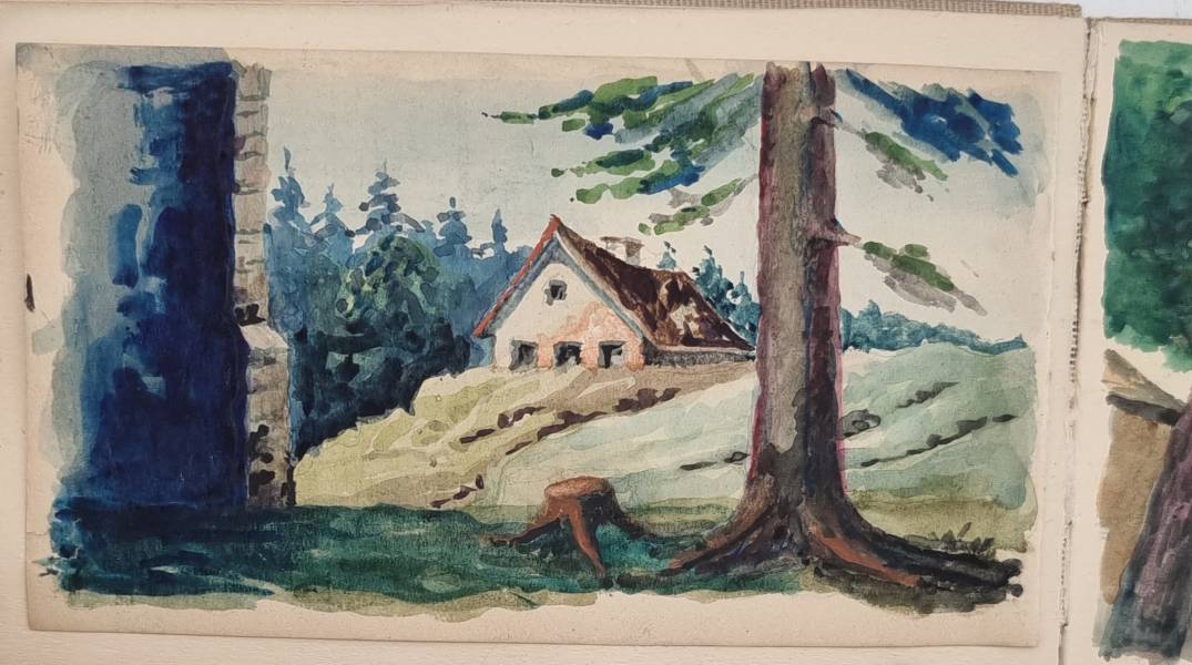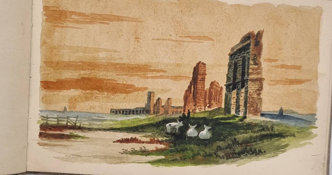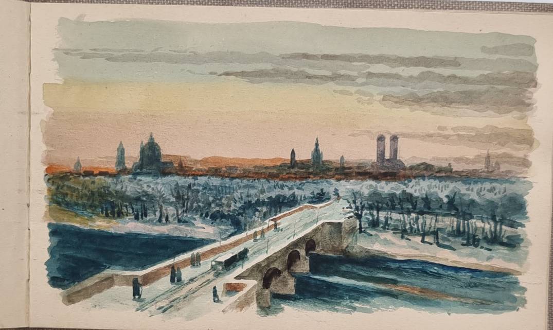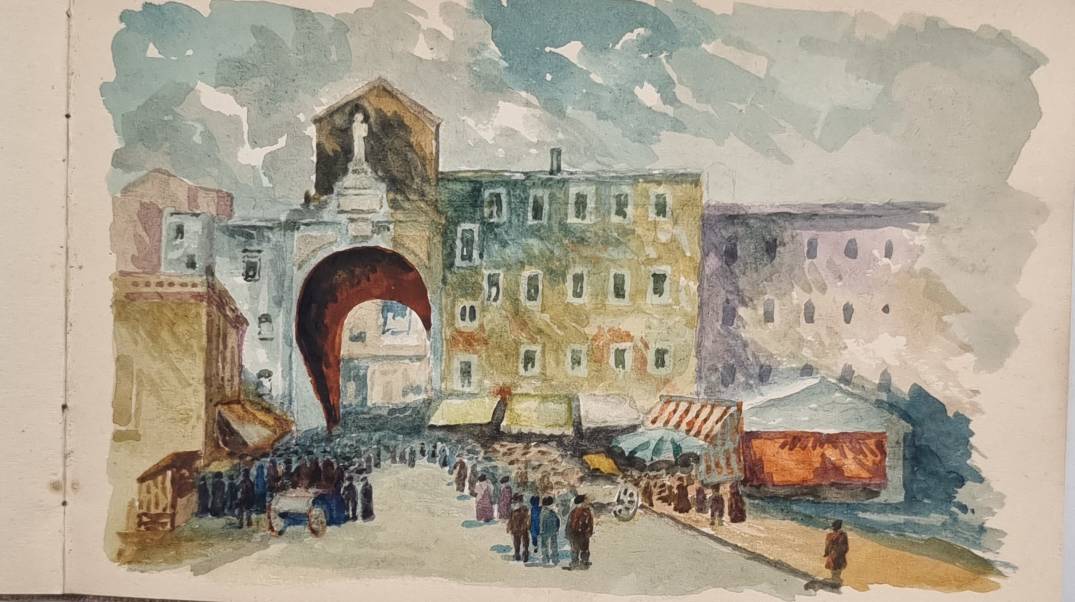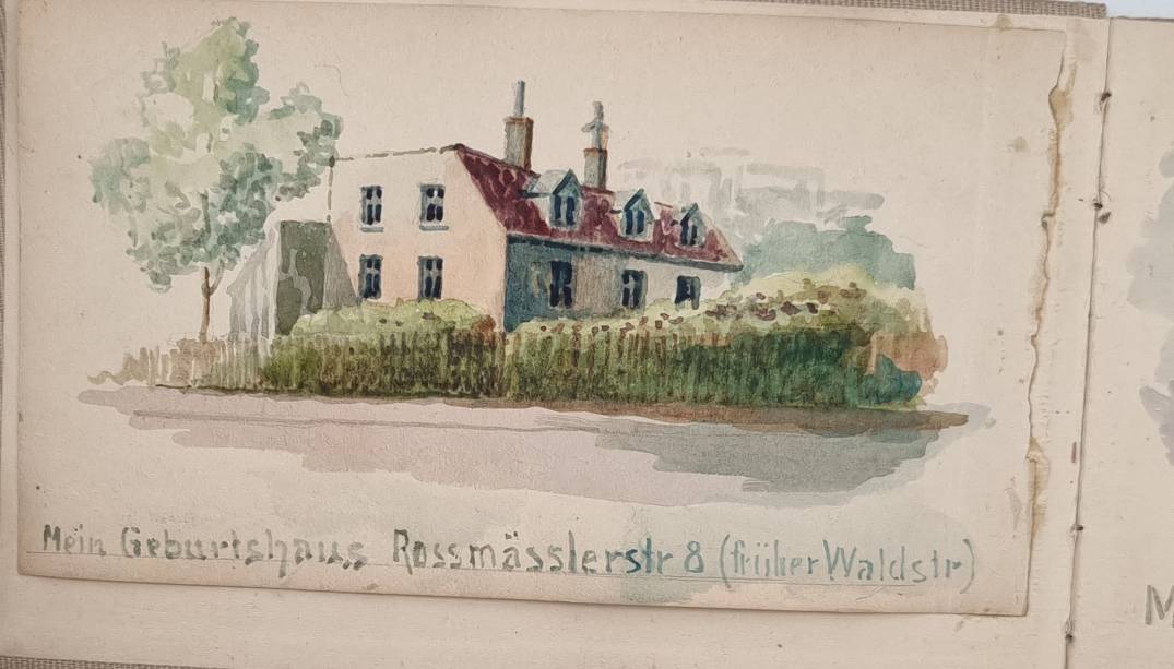 Leipoldt, Otto: Aus meinen Wanderungen. (3 Bände und ein Studienbuch). 4 Skizzenbücher einer Leipziger Künstlers. Mit mehr als 110 Aquarellen und Zeichnungen. 1869-1892. Querformat ca. 12 x 18,5 cm bzw. 12,5 x 20,5 cm. Graue Leineneinbände der Zeit. Auf den Innendeckeln mit Stempel „Otto Leipoldt Leipzig Sebastian Bach Str. 17“ und handschriftlichem Titel „Aus meinen Wanderungen“ sowie Datierung 1932. Das Einwohneradressbuch für Leipzig aus dem Jahr 1932 verzeichnet unter dieser Adresse einen „Otto Leipoldt“ mit der Berufsbezeichnung „Vertr[eter]. Die Bilder teils mit Datum versehen (1869-1892) und häufig mit Ortsangabe. Band I: Mit 27 Aquarellen u.a. London, Cornwall, Dartmouth, Rotterdam, Hamburg, München, Dillingen, St. Gotthart, Comer See, Lago Maggiore, Neapel; Band II: 30 Aquarelle u.a. „Mein Geburtshaus Rossmässlerstr. 8 (früher Waldstraße), Pleisenburg, Dresden, Görlitz, Alt Plauen, Burgstein, Werratal, Bremen, Meran, Hamburg, Holstein; Band III: Mit 26 Aquarellen, u.a.: Neapel, Rom, Florenz, Venedig; Band IV: Skizzenbuch: Mit ca. 30 Bleistiftzeichnungen mit Architektur- und Inndendekoration-Details sowie Kinderstudien und Schloß Ambras. Die Aquarelle sind von starker Farbigkeit und teils sehr stimmungsvoll.