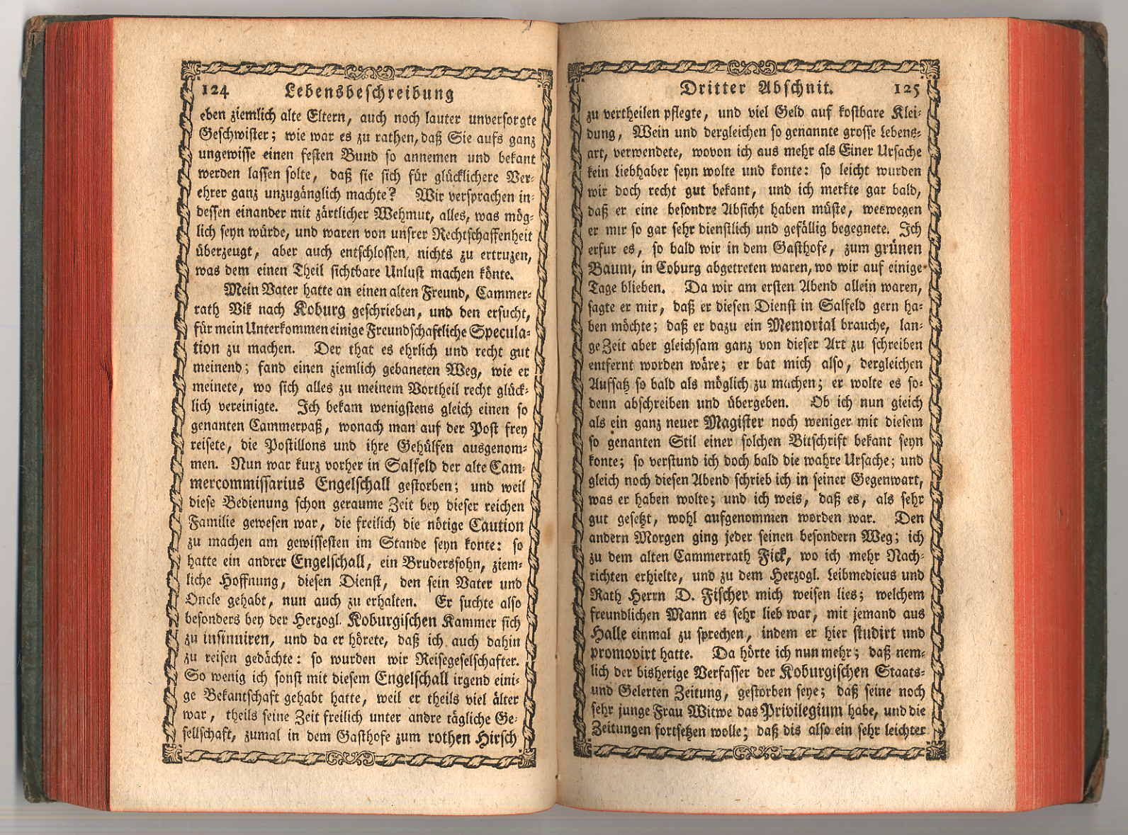 Semler, Salomo: Lebensbeschreibungvon ihm selbst abgefaßt. Halle, 1781. Ca. 20 x 12,5 cm. (32) S., 352 Seiten. Pappband der Zeit. Der 2. (hier nicht vorliegende) Teil erschien 1782. Einband etwas berieben. Seiten teils stockfleckig (anfangs stärker). Jede Seite mit Schmuckrand. Johann Salomon Semler (1725-1791, evangelischer Theologe) „zählt zu den bedeutendsten dt. ev. Theologen der Aufklärungszeit und eröffnete der prot. Theologie durch seine Vielseitigkeit auf zahlreichen Gebieten neue Wege. Durch die sein Denken kennzeichnende konsequente Historisierung seiner theol. Erkenntnisarbeit und den damit verbundenen methodischen Zugriff auf seine Quellen wurde er zu einem der Begründer und maßgeblichen Vertreter der historisch-kritischen Forschung in Deutschland im 18. Jh.“ (Dirk Fleischer in NDB 24 S. 236-237).