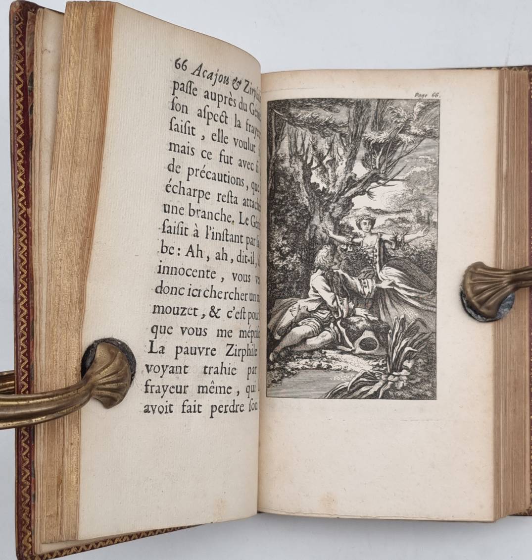 [Duclos, Charles Pinot]: Acajou et Zirphile, conte. Beigebunden: [Carl Gustav de Tessin]: Faunillane ou l’infante jaune, conte. A Minutie. (d.i. Paris), [Prault], 1744. Ca. 16 x 10 cm. Sowie: A Badinopolis (d.i. Paris), chez les Freres Ponthommes, à L’Enseigne du Roy d’Egypte. (16) S., 161 Seiten, mit gestochenem Frontispiz, Titelvignette sowie 9 Kupferstichtafeln; (4) S., 48 Seiten, mit gestochenem Frontispiz, Titelvingette sowie 9 Kupferstichtafeln. Roder Ganzledereinband mit Deckelfileten und Innenkantenvergoldung. Goldschnitt. Seiten teils leicht fleckig, einige Seiten am Rand etwas wasserrandig. Interessante Zusammenführung: François Boucher fertige ursprünglich um 1740 die Zeichnungen für Faunillane ou l’infante …, das in nur wenigen Ausgaben erschien. Die Abbildungen wurden dem Verleger Prault gegeben, der daraufhin bei Duclos eine Erzählung in Auftrag gab, um die Kupferstiche dann im Band Acajou et Zirphile erneut wiederzugeben. Text auf französisch.