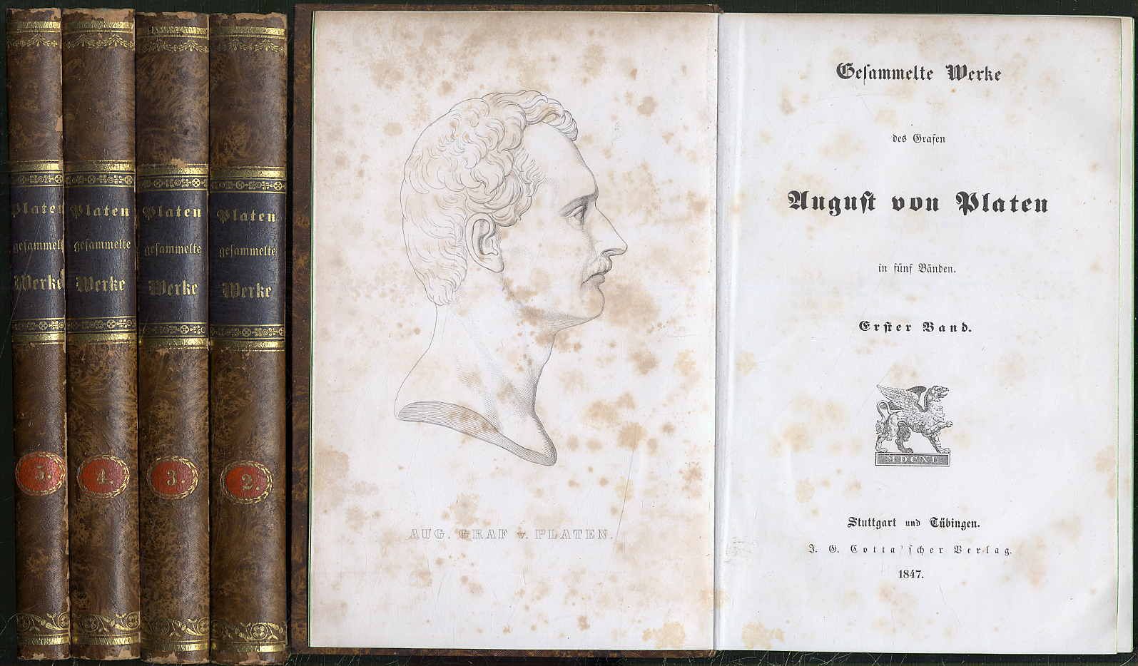Platen, August v.: Gesammelte Werke. 5 Bände. Stuttgart u. Tübingen, J. G. Cotta’scher Verlag, 1847. Ca. 20,5 x 13,5 cm. Mit einem Titelbild. Pappbände der Zeit mit geprägten Rückenschildern. Mit grünem Farbschnitt. Rücken bestoßen. Vorsätze stärker gebräunt. Seiten innen nur vereinzelt kleine Stockfleckchen, sonst sauber und gut.