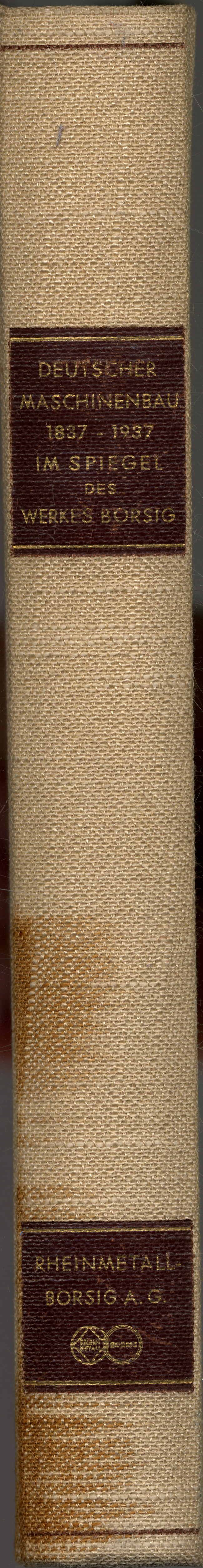 Rheinmetall-Borsig Aktiengesellschaft (Hrsg.): Deutscher Maschinenbau 1837-1937 im Spiegel des Werkes Borsig. Berlin, 1937. Ca. 29,5 x 21,5 cm. 483 Seiten. Mit zahlreichen Abbildungen (darunter 3 ganzseitige farbige). Orig.-Leinenband. Rücken mit braunem Fleck, sonst guter Zustand. Aus dem Inhalt u.a.: Werk Borsig und der deutsche Lokomotivbau; Kolbenverdichter und Kolbenpumpe; Vom Werden der Kältetechnik; Chemische Apparatebautechnik.
