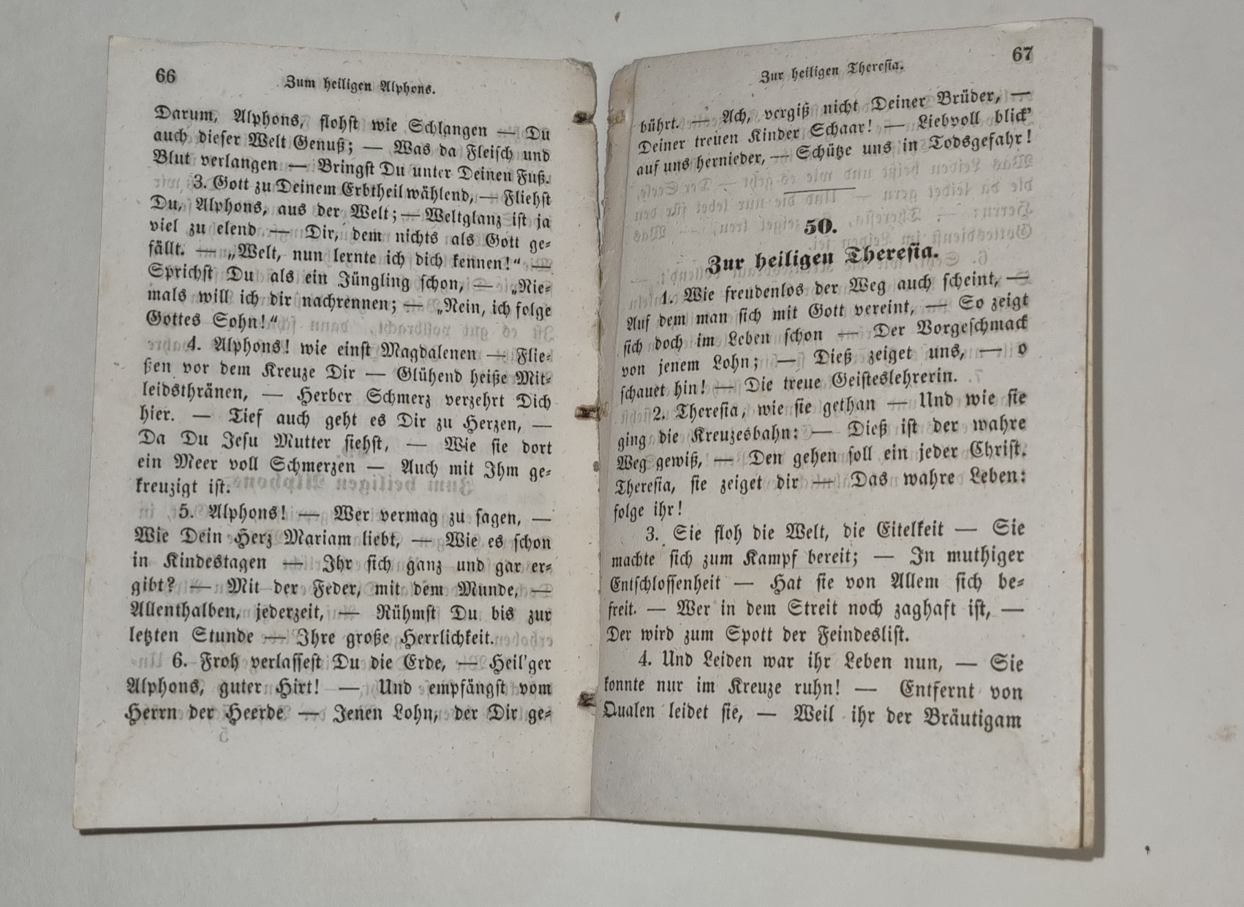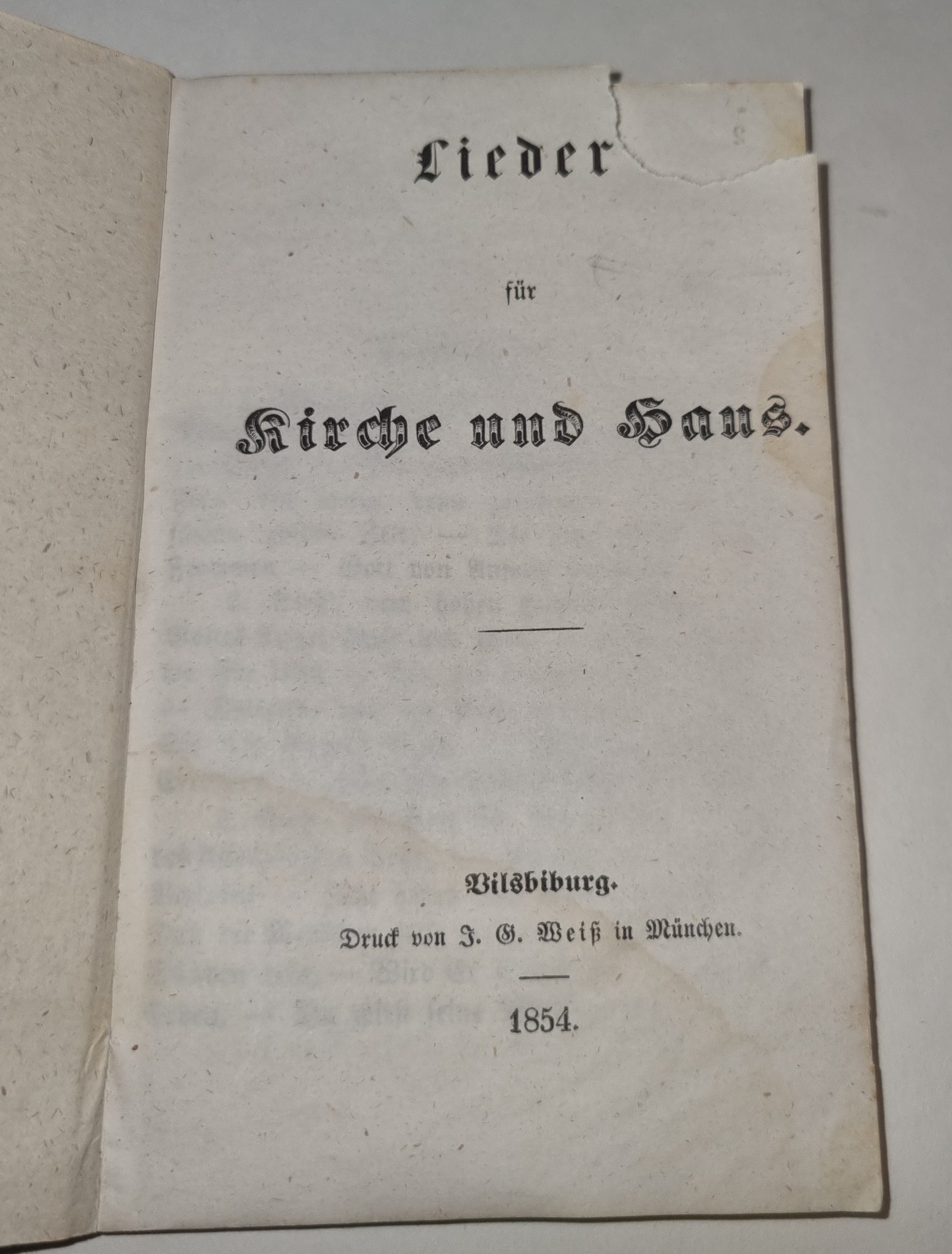 Lieder für Kirche und Haus. Vilsbiburg, Druck von J. G. Weiß in München, 1854. Ca. 14 x 9 cm. 68 Seiten. Grüner Pappband der Zeit. Einbandrücken mit Fehlstelle, daher Buchblock etwas gelockert. Titelblatt mit Eckabriss (ohne Textverlust). Seiten am Rand mit leichtem braunem Fleck, sonst gutes Exemplar. Enthält 50 Liedtexte.